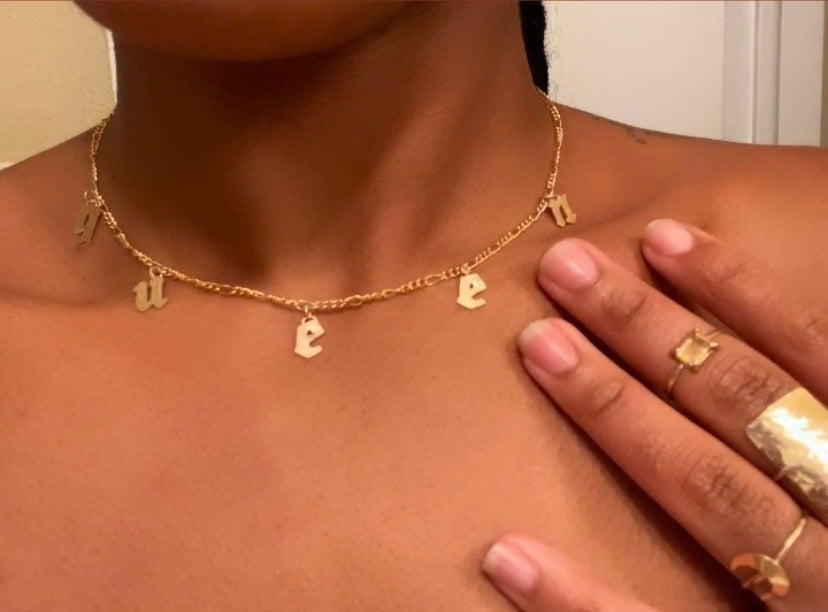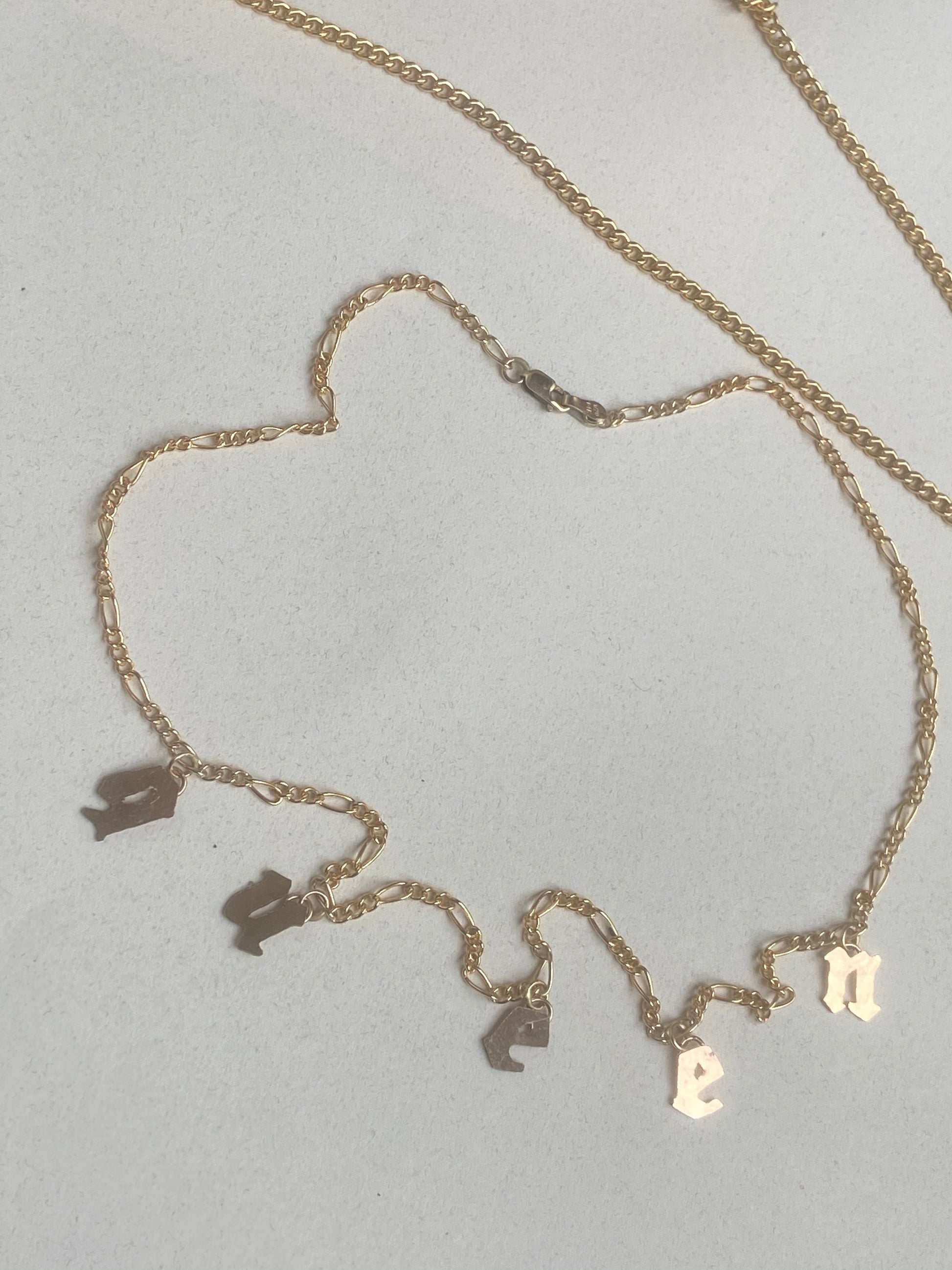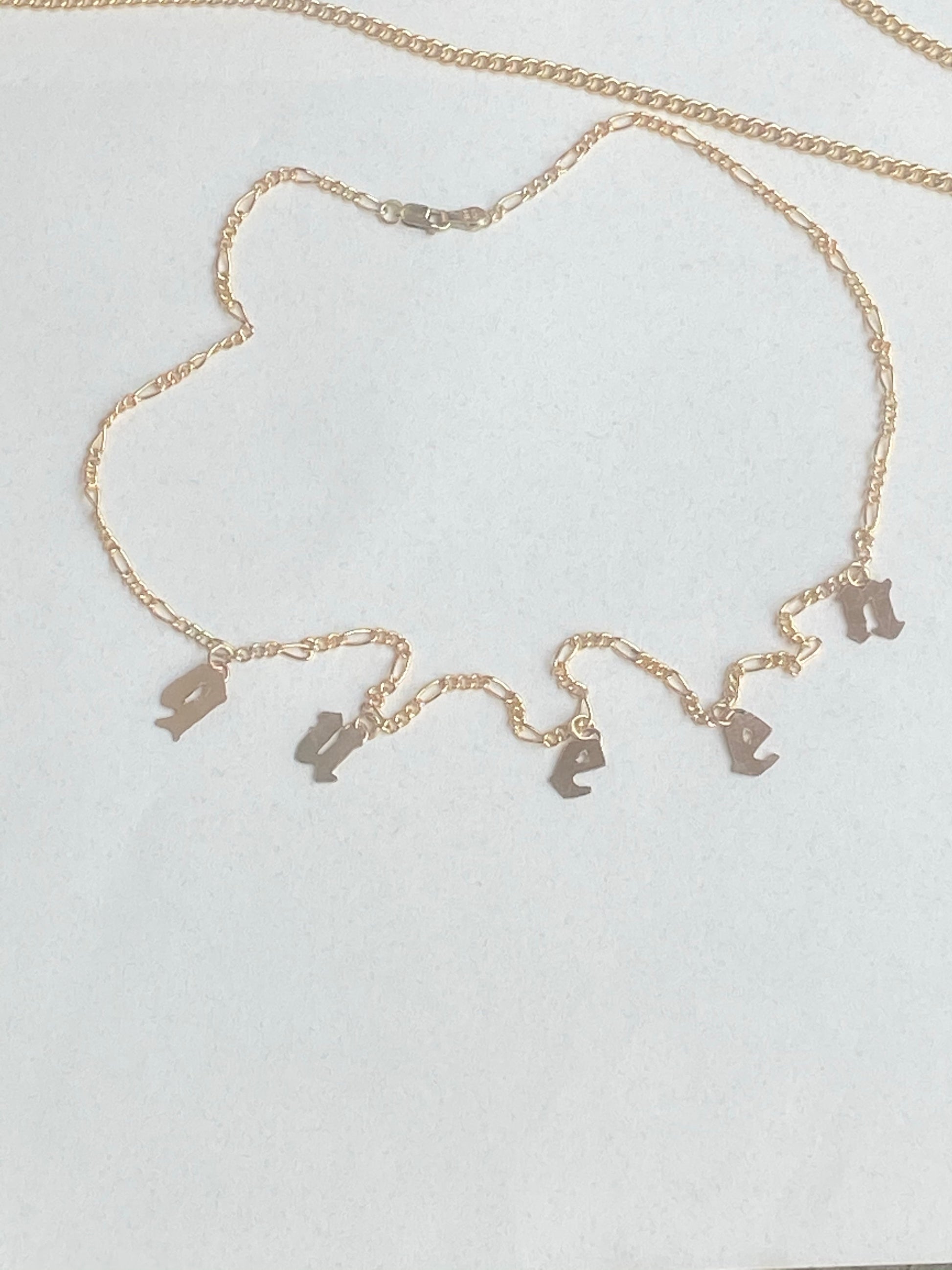 Materials: 14kt Gold Filled Figaro chain 16 inches, 14kt Gold Filled letters