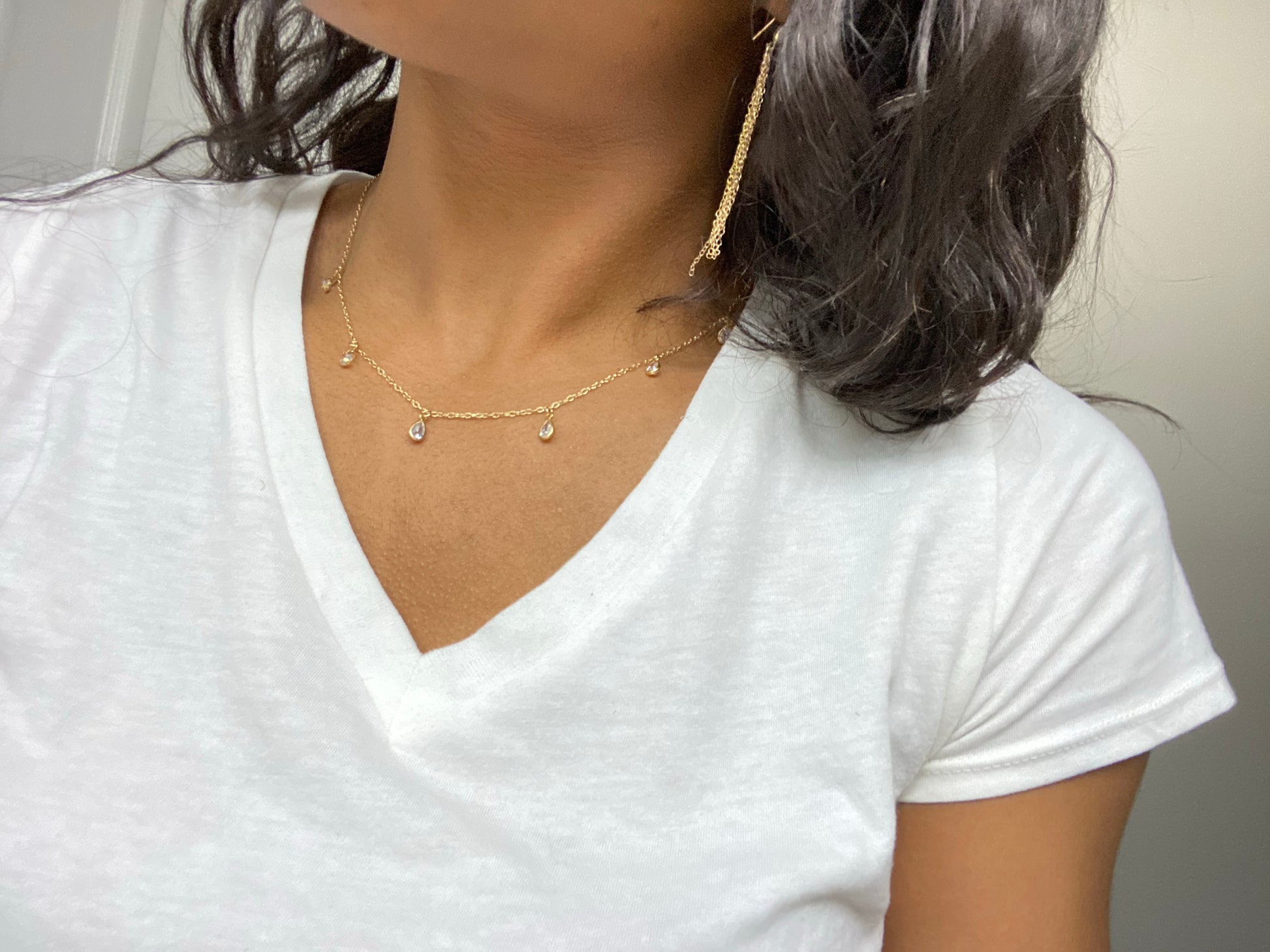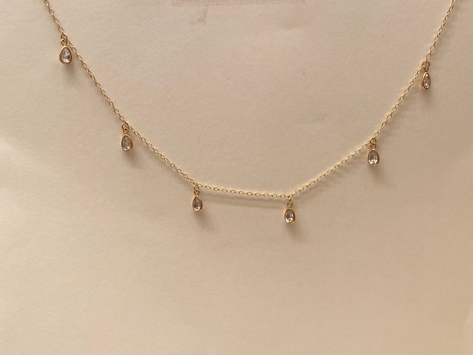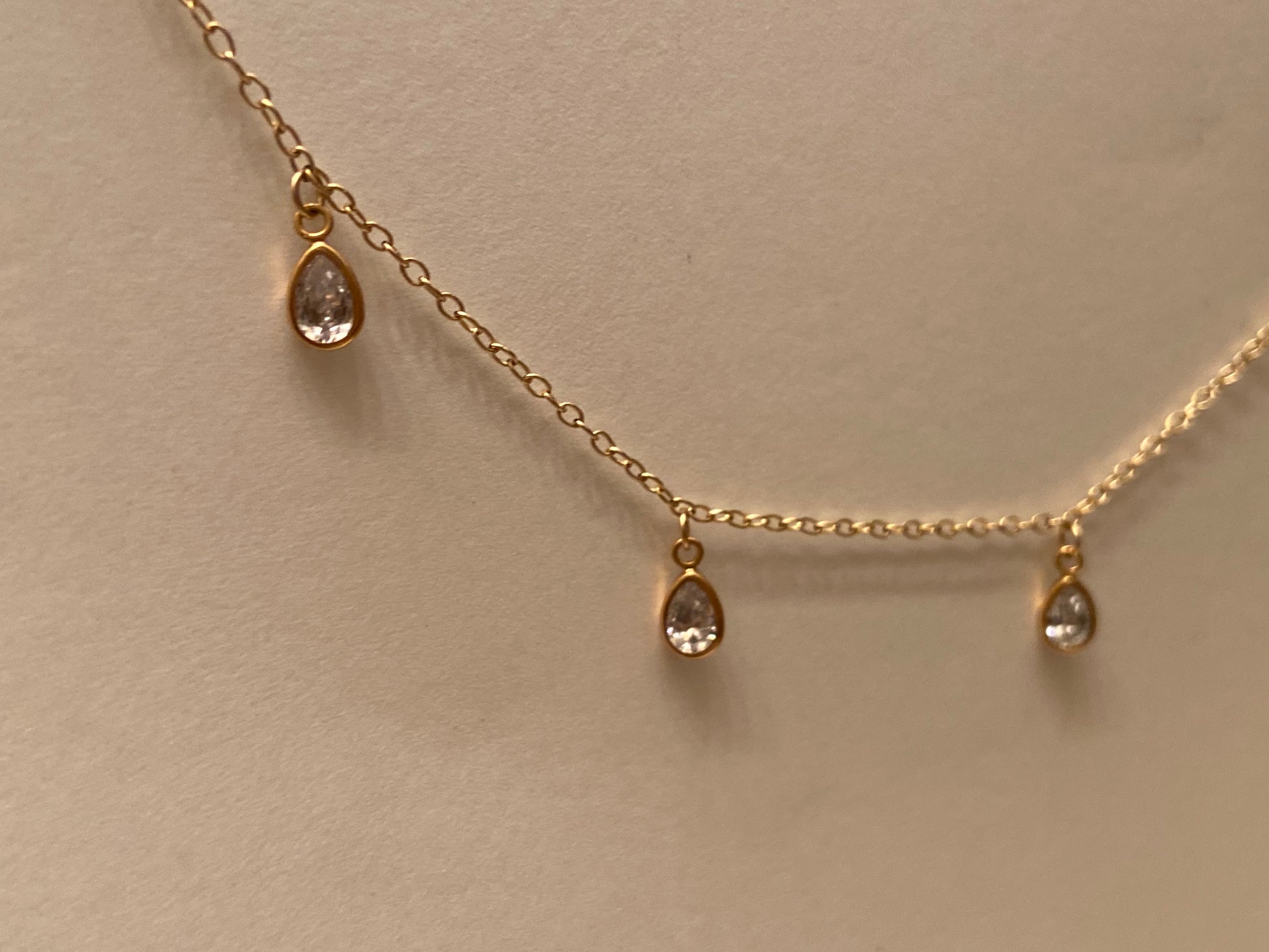 Materials: 14kt Gold Filled cable chain 20 inch with pear cut cubic zirconia stones set in 14kt Gold Filled